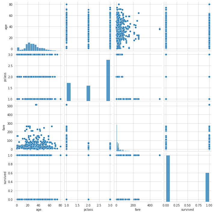 pair = titanic[['age', 'pclass', 'fare', 'survived']]