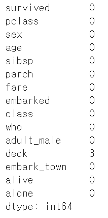 print(col, ':', 0) #NaN 값이 없으면 0개 출력