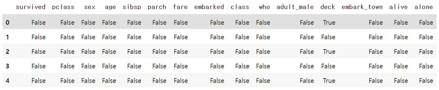 #상위 5개 행의 누락 데이터 개수 구하기(isnull)