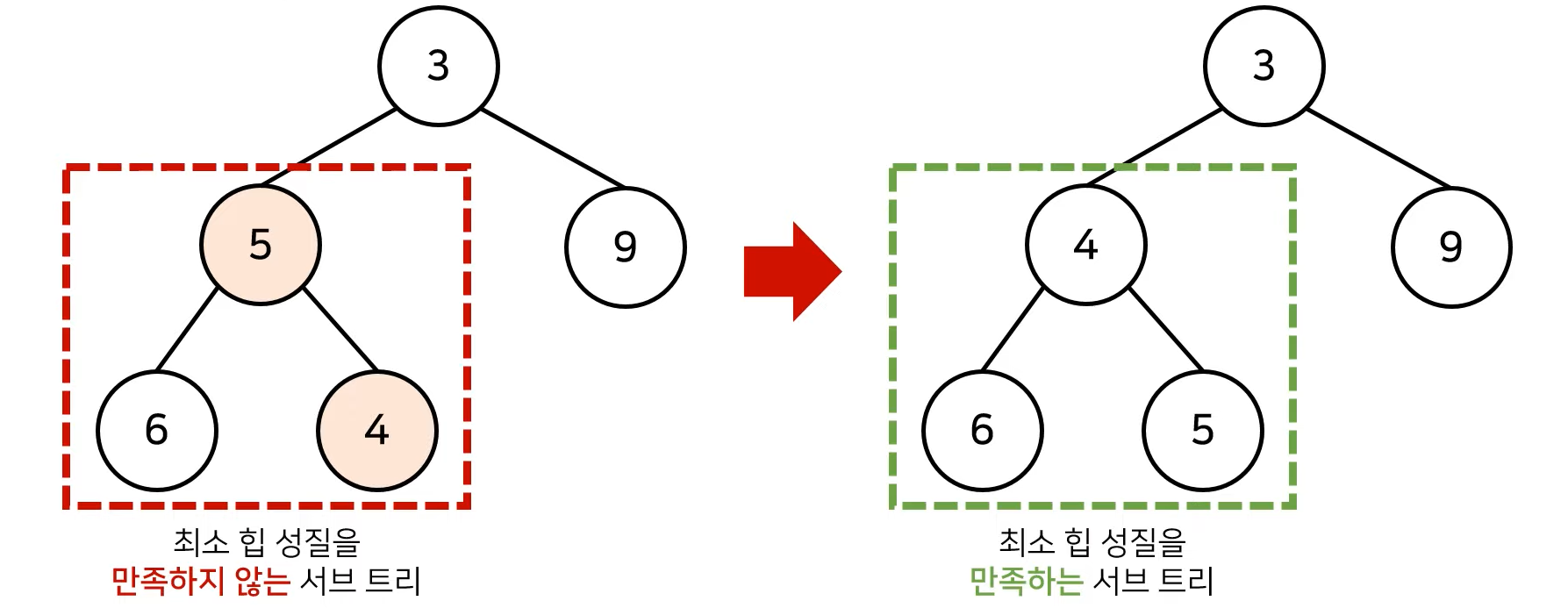 이후에 루트 노드에서부터 하향식으로(더 작은 자식 노드로) Heapify()를 진행