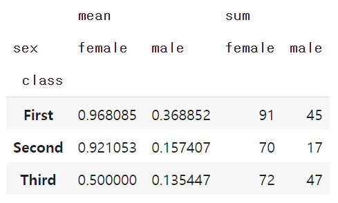 aggfunc=['mean', 'sum']) # 데이터 집계 함수