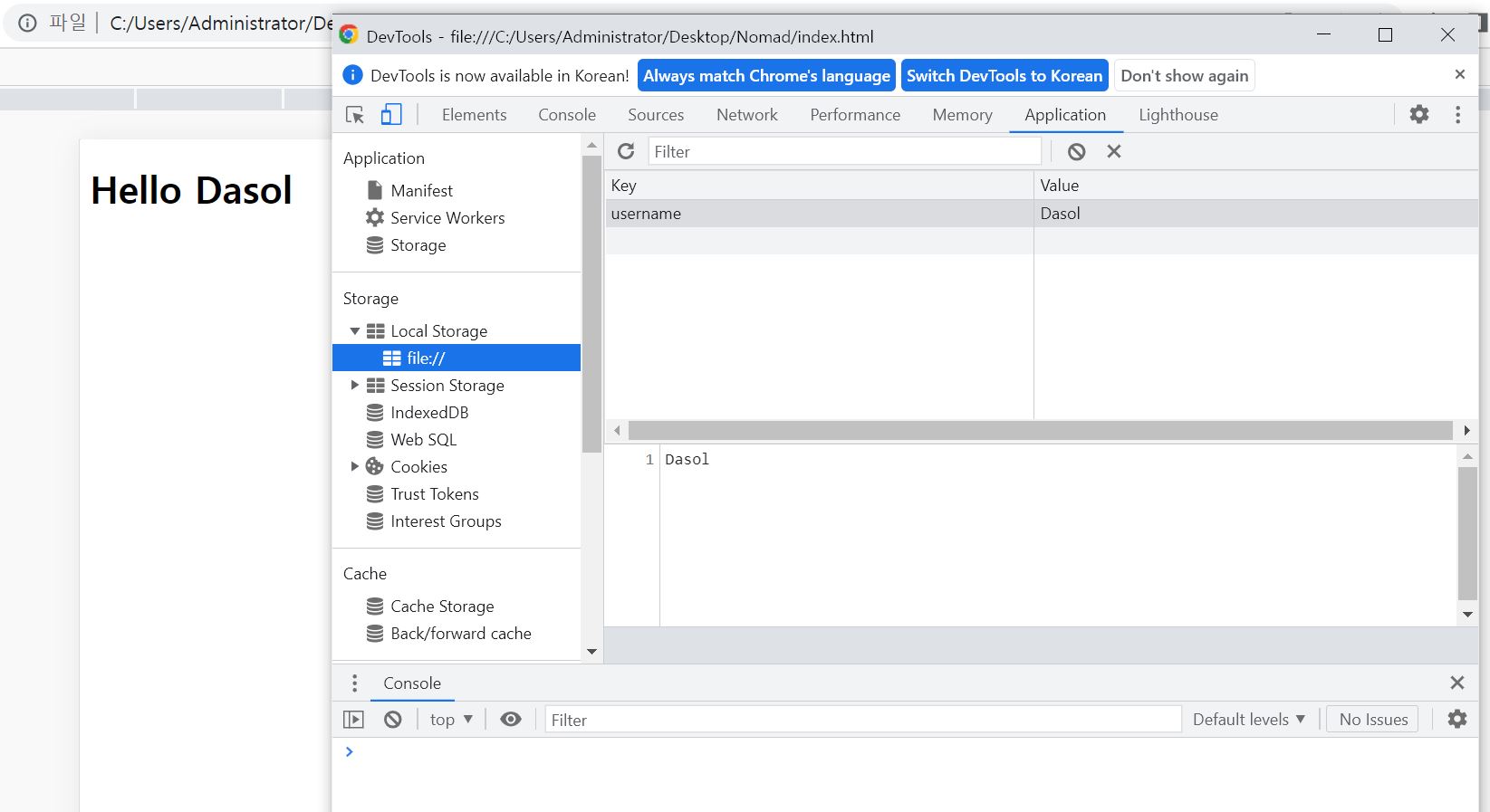 Local Storage에도 값이 잘 들어와 있고, 인사도 제대로 출력되는 것을 볼 수 있다.