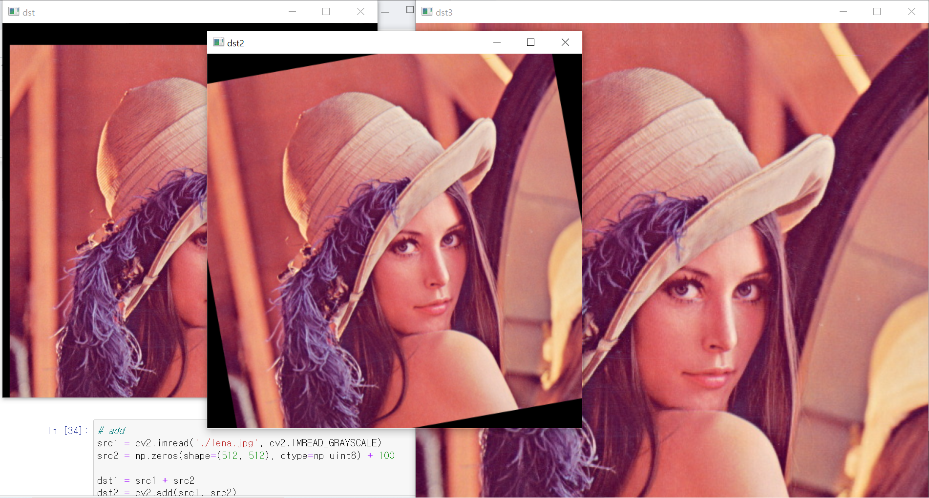 dst3 = cv2.compare(dst1, dst2, cv2.CMP_EQ) # 요소가 같음