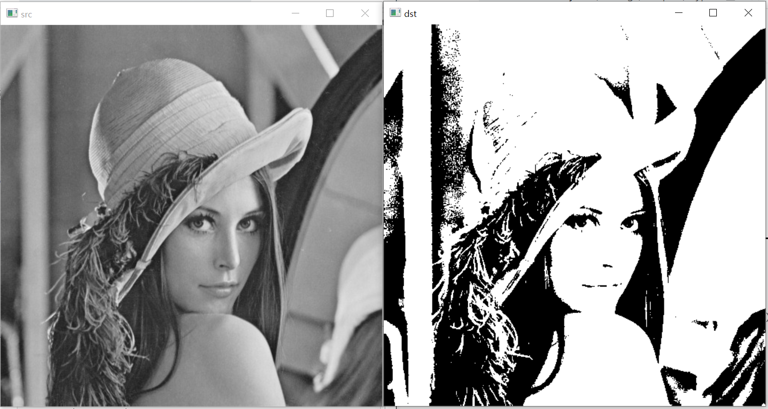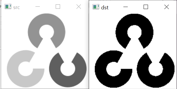 ret, dst = cv2.threshold(src, 100, 255, cv2.THRESH_BINARY) #threshold=100, THRESH_BINARY