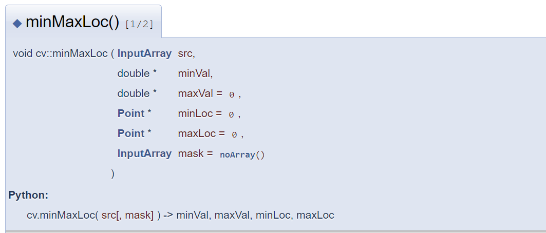 - minMaxLoc() : 최대값, 최소값, 최대값 위치, 최소값 위치 반환