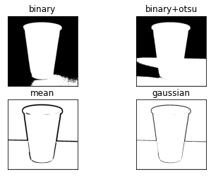 titles=['binary','binary+otsu','mean','gaussian']