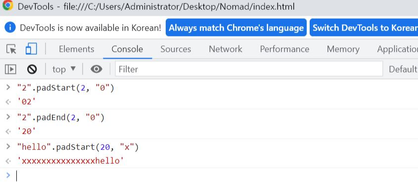 예를 들어, padStart(2, "0")라고 하면 문자열 길이가 2여야 하고 그보다 작으면 앞쪽에 0을 채운다는 의미이다.