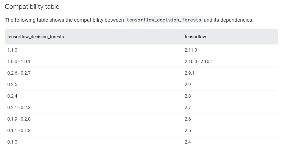 아래는 반드시 맞춰 줘야할 TensorFlow Decision Forests 와 TensorFlow의 버전 매칭표이다.
