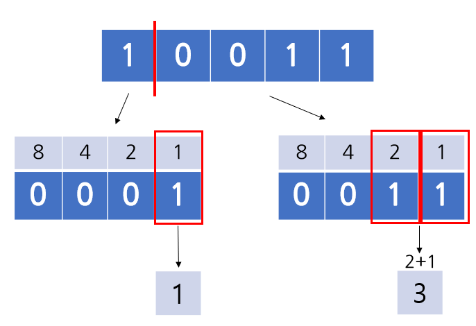 : 2의 n제곱 칸을 만들어 놓고 조합해서 집어 넣기 (19는 16 + 2+ 1 이기 때문에 16, 2, 1에 각각 1씩 넣어준다)