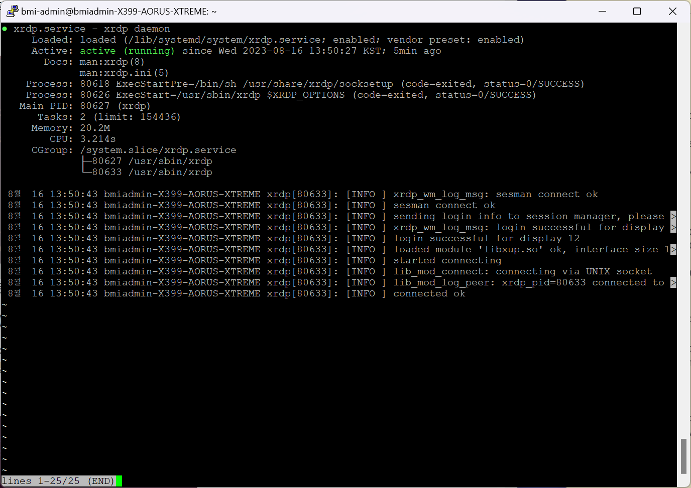 Xrdp 서비스가 실행되고 있는지 확인합니다. (참고로, Xrdp 서비스는 설치 시 자동으로 시작됩니다)