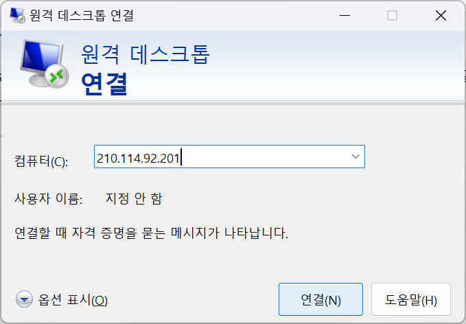 로그아웃을 완료했다면, 원격 데스크톱 클라이언트를 실행하고 원격 시스템의 IP 주소를 입력합니다. 그 후 '연결' 버튼을 클릭하여 접속을 진행합니다.