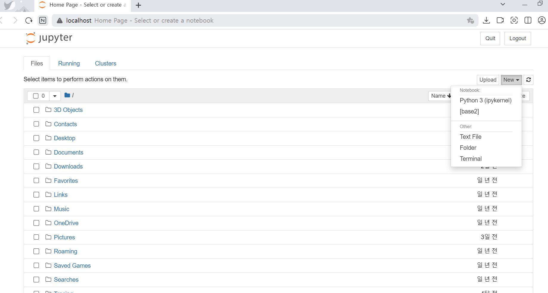 우측 상단의 new를 클릭하면 새로운 가상환경이 있는 것을 확인할 수 있다. 해당 커널을 통해서 새로운 작업을 수행할 수 있다.