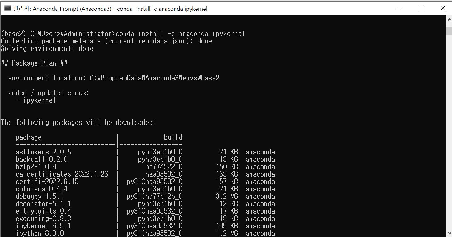 $ conda install -c anaconda ipkernel(설치할 라이브러리)