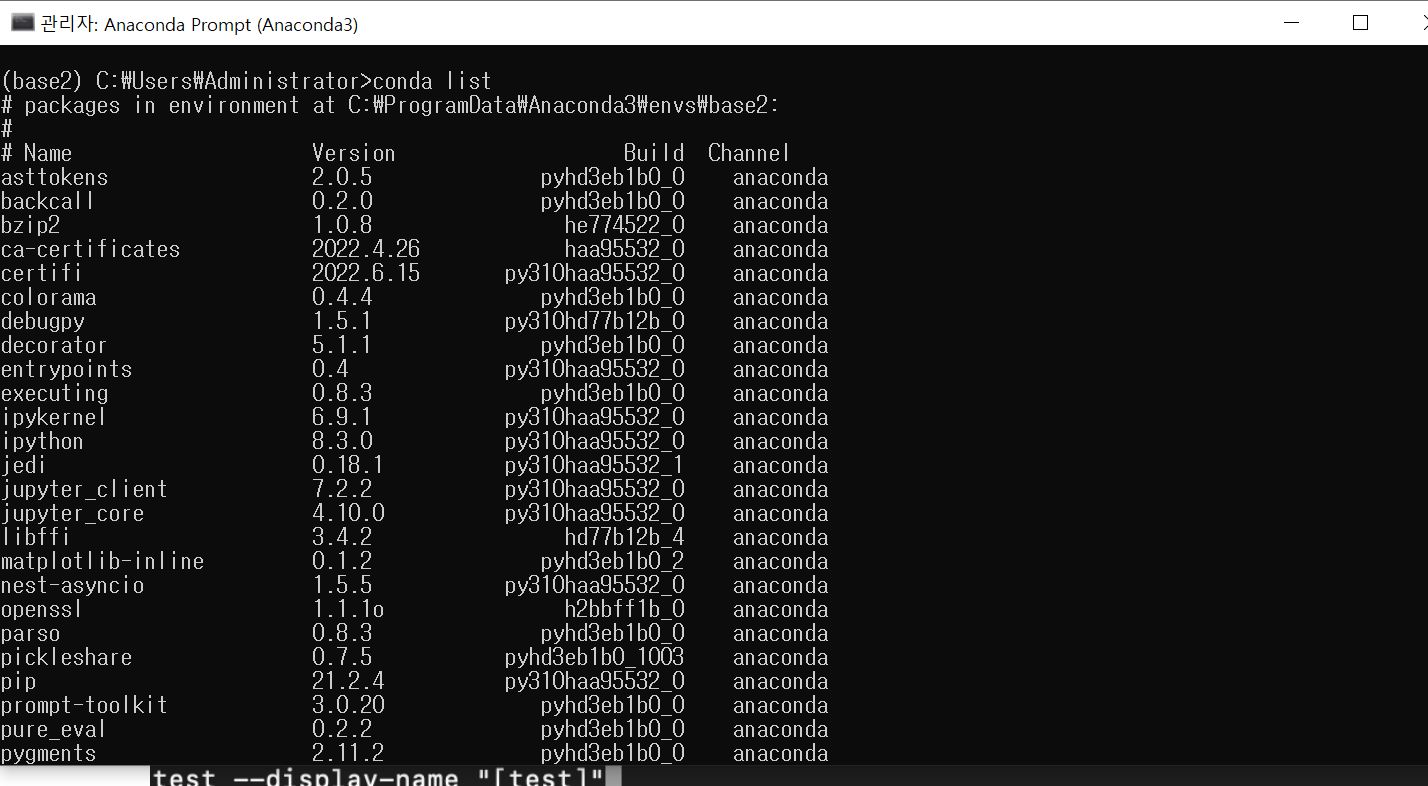 // conda install로 설치된 라이브러리의 목록을 확인할 수 있다.