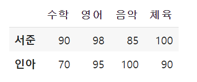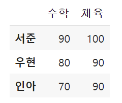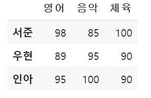 df3 = df.drop(['우현', '인아'], axis = 0) #원본에서 수정된 데이터를 바로 df3으로 받기