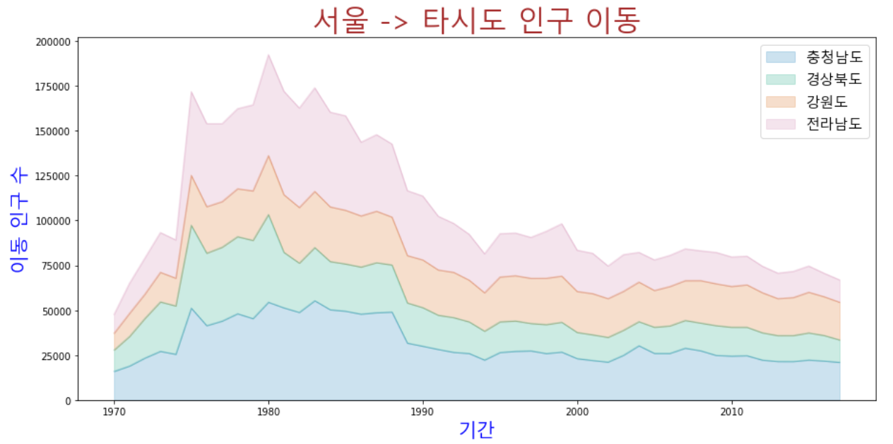 - Area plot : 각 열의 데이터를 선 그래프로 구현 후 선 그래프와 x축 공간에 색을 입힌다.