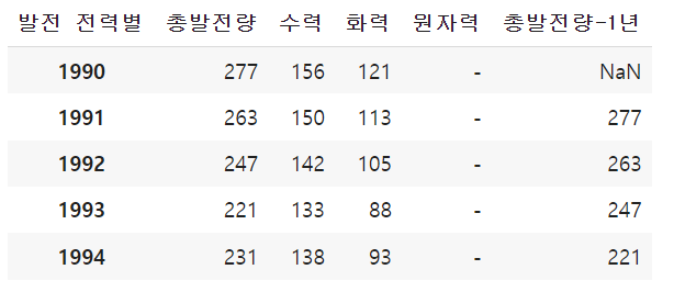 df['총발전량-1년'] = df['총발전량'].shift(1)
