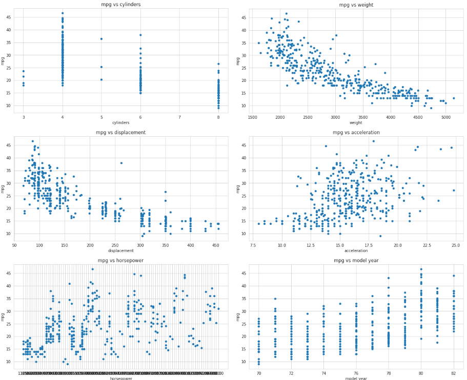 df_auto.columns = ['mpg','cylinders','displacement','horsepower','weight','acceleration','model year','origin','name']
