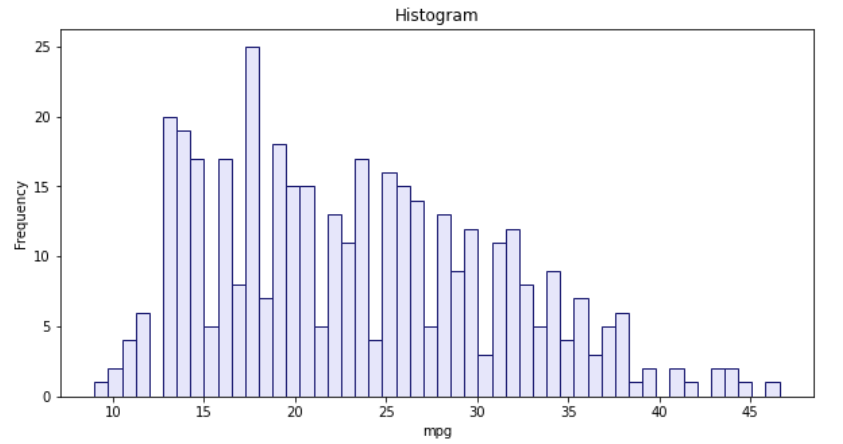 df6 = df_auto['mpg'].plot(figsize=(10,5),kind='hist',color='lavender', edgecolor='midnightblue',bins=50)
