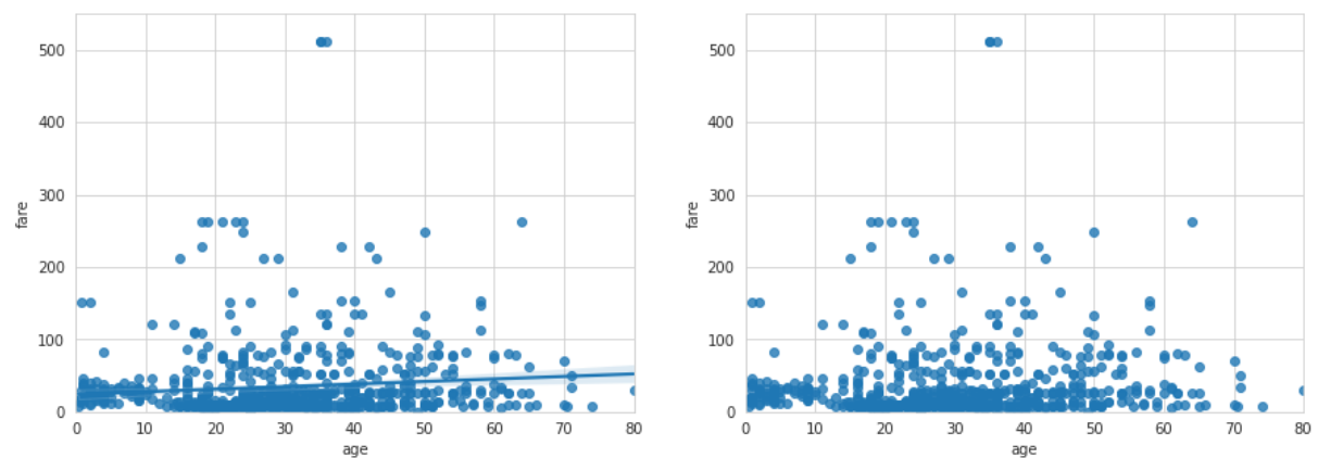 sns.regplot(x = 'age', y = 'fare', data=titanic, fit_reg=False, ax=ax2) #회귀선 생략